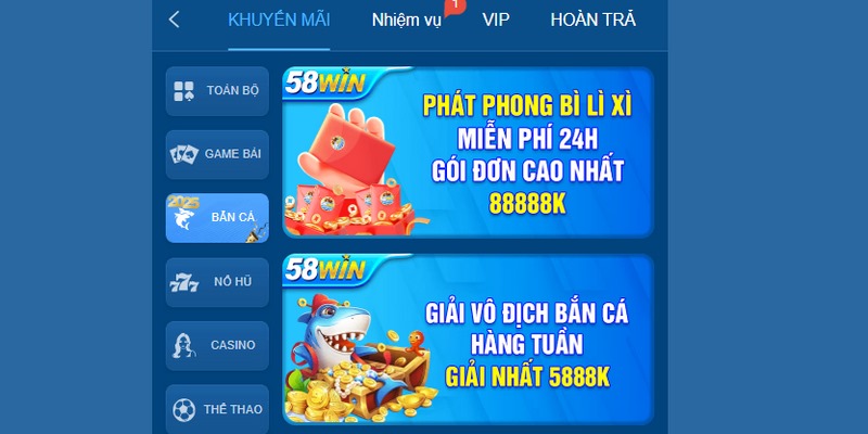Ngay sau đây sẽ cập nhật đến bạn một số khuyến mãi săn bắn cá dành cho những anh em tham gia vào chuyên mục giải trí này tại 58WIN: